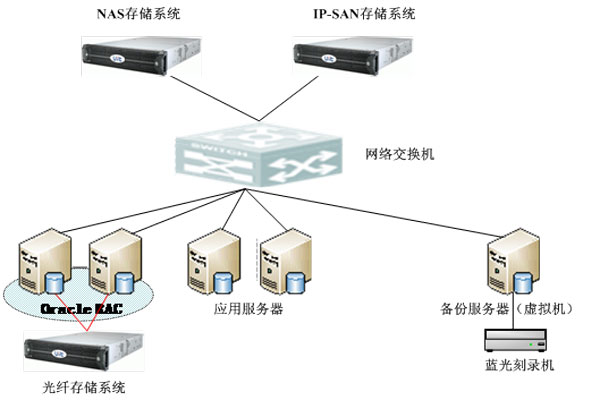 本方案為(wèi)客戶設計(jì)一套包含存儲設備、備份軟件及光盤刻錄機在內(nèi)的完整的存儲備份系統,系統拓撲如下圖所示: