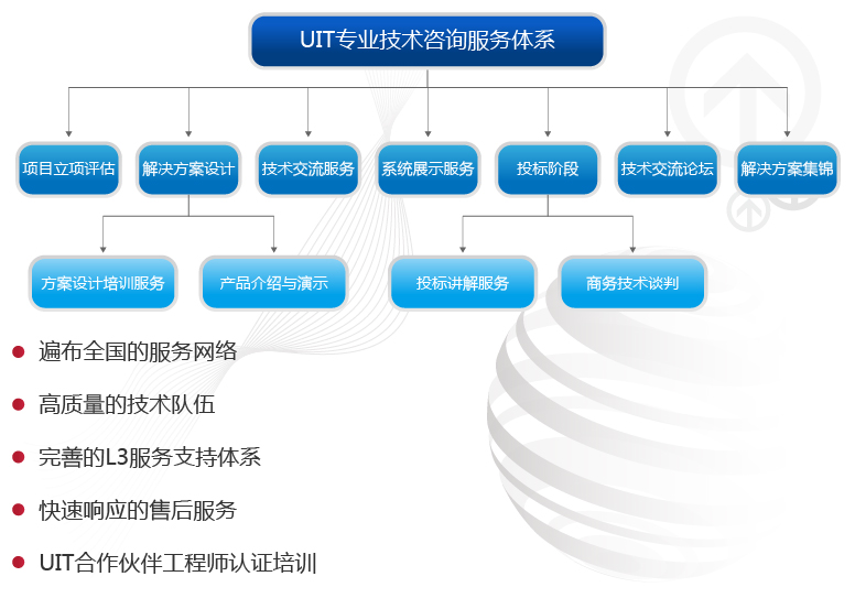 UIT技(jì)術(shù)服務以保證客戶數(shù)據安全和(hé)達到客戶滿意為(wèi)宗旨,通(tōng)過廣泛覆蓋的服務體(tǐ)系,完善的UIT服務流程專業化的技(jì)術(shù)支持隊伍,為(wèi)客戶提供7*24 的高(gāo)品質服務UIT 技(jì)術(shù)服務涵蓋從客戶需求分析開(kāi)始的規劃、設計(jì)、部署和(hé)使用UIT 數(shù)據存儲産品的全部過程 具備快速響應和(hé)本地化支持的優勢。